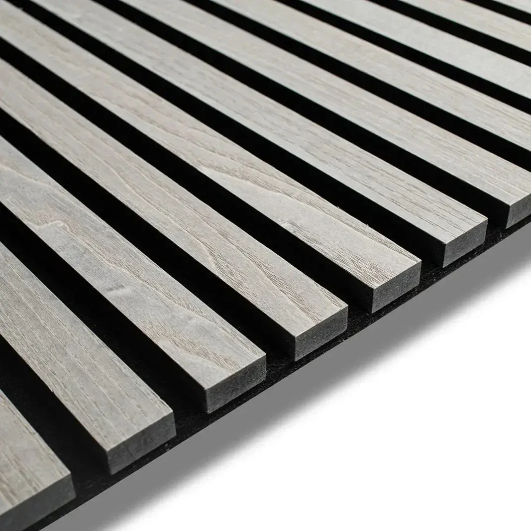 Jedes Akustikpaneel besteht aus einer 7 mm dicken Akustikfilzunterlage aus recyceltem PET-Kunststoff und furnierten MDF-Lamellen im Abstand von 13 mm. Die PET-Rückseite wirkt als effizienter Schallabsorber und reduziert Reflexionen im mittleren und hohen Frequenzbereich. Die 12 mm starken MDF-Lamellen erhöhen die strukturelle Stabilität und verbessern gleichzeitig die Diffusion, wodurch der Schall gleichmäßig im Raum verteilt wird. Zusammen sorgen diese Schichten für einen ausgewogenen akustischen Effekt, der den Nachhall reduziert und die Klarheit in belebten oder offenen Räumen verbessert.